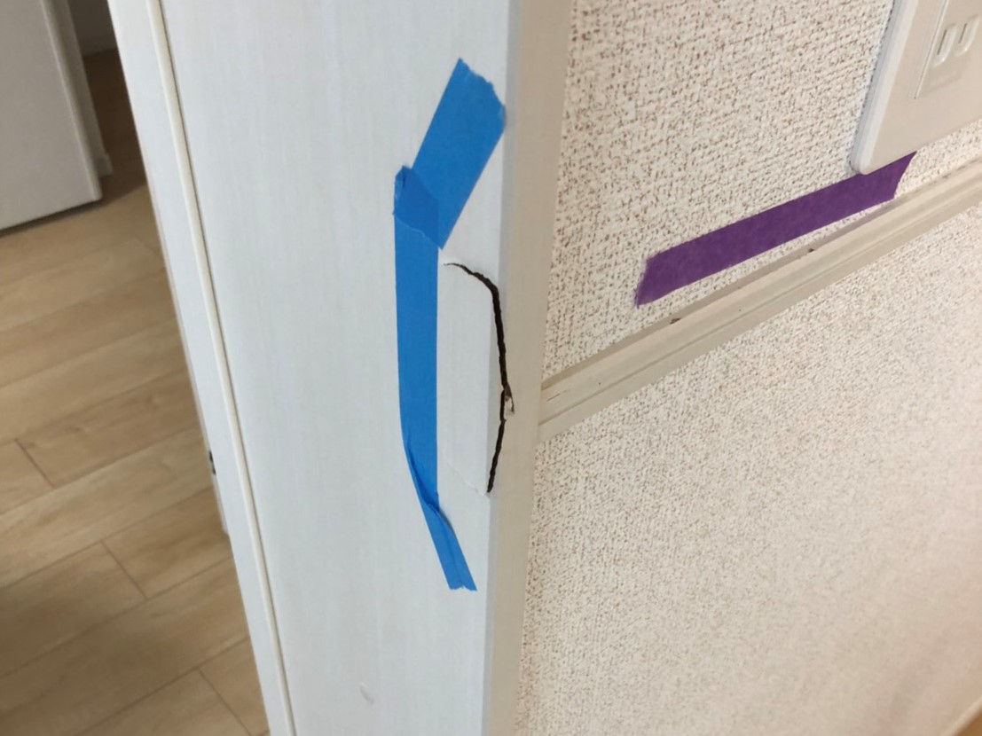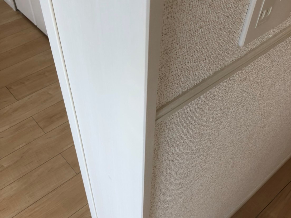 白地に淡い色見の木目調シートの木枠の補修事例になります。